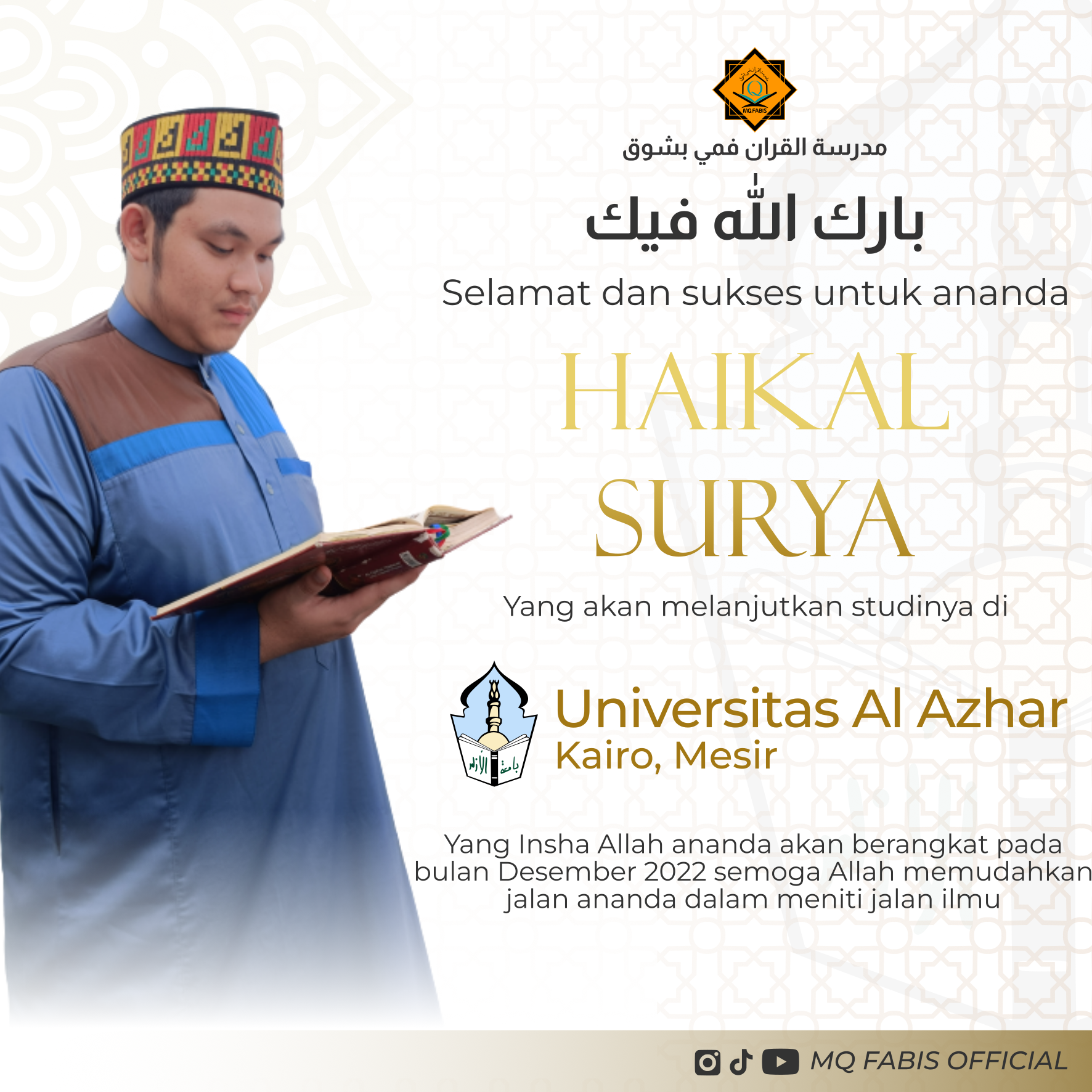 Alhamdulillah rabbil Alamin kami seluruh anggota keluarga besar MQ FABIS turut Bahagia dan senang pada hari rabu pada tanggal 7 desember salah satu santri kami yang bernama Haikal Surya telah diterima dan melanjutkan studinya di Universitas Al Azhar Kairo, Mesir