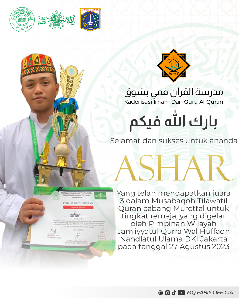 Alhamdulillah pada 27 Agustus 2023 salah satu santri kami mendapatkan juara 3 dalam Musabaqoh Tilawatil Quran cabang Murottal untuk tingkat remaja, yang digelar oleh Pimpinan Wilayah Jam'iyyatul Qurra Wal Huffadh Nahdlatul Ulama DKI Jakarta. Sekaligus merupakan juara perdana dari awal berdirinya pesantren kami, semoga para santri yang lain dapat mengikuti jejak ananda Ashar dan membuat harum nama MQ FABIS di rancah Nasional maupun Internasional.